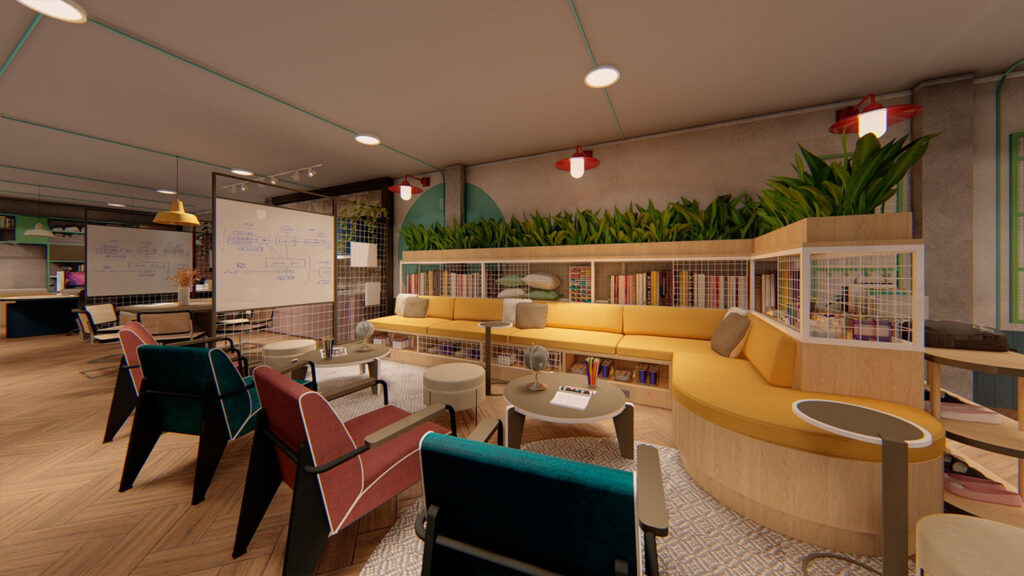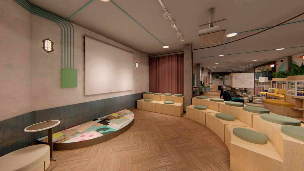 Casa cultural de encuentros, donde los jóvenes hallan un lugar para el arte, el juego y el pensamiento. Es un espacio diseñado para conversar profundamente sobre los deseos más íntimos que a nadie le interesa escuchar. Pero que en este auditorio cobran vida. De las conversaciones más tontas hasta las más profundas, aquí, son bienvenidas. Los jóvenes buscan y necesitan ese espacio donde divagar horas dejándose llevar por el tren de pensamientos sinfín antes de continuar con el día a día. Donde solo hable la música, el baile, la inspiración, el color, la poesía, imágenes y vídeos brutales , donde sucedan infartos estéticos, silencios prolongado y sin interrupciones. Diáfano, con composiciones y elementos al rededor que nos regalen más ideas, donde las miradas se pierden en la observación de cada detalle.